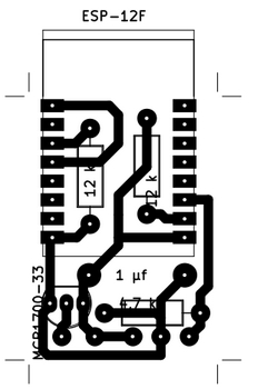 Voici le petit circuit imprimé (Vu coté composants) ; il supporte 2 connecteurs femelles au pas de 2mm car l'ESP est équipé de connecteurs mâles. Cela permet aussi de placer des résistances sous l'ESP.