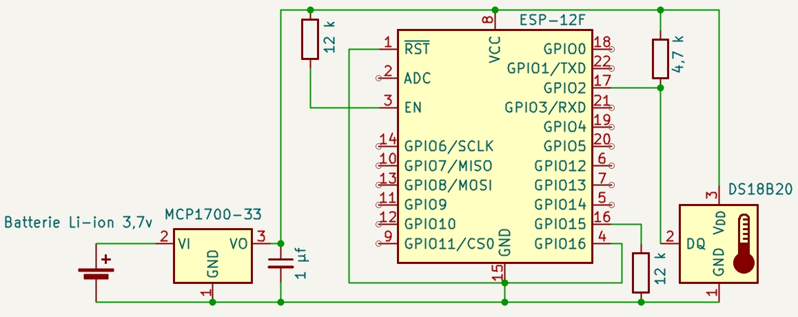 Le schéma est vraiment simple. On notera la connexion de GPIO16 sur reset pour permettre le réveil après le deepsleep.