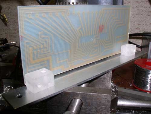 Les circuits imprimés mesurent 120 X 50 mm. Ils sont montés perpendiculairement à la face avant à l'aide de deux équerres plastiques. La face avant est constitué d'une bande d'aluminium de 20 X 152 mm. perçée à 3 mm. Les modules ainsi constitués viennent prendre place dans un rack réalisé avec de la cornière d'aluminium de 15 x 15.