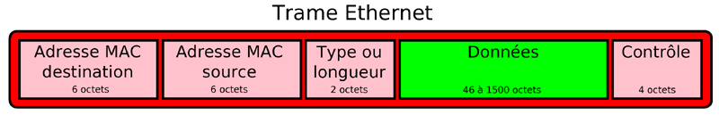 Norme IEEE 802.3 - Protocole de réseau local. Chaque appareil relié au réseau possède par construction une adresse MAC qui est unique au niveau mondial. Les données sont placées dans des trames de longueur variable qui circulent dans des supports physiques variés : câble coaxial (obsolète), câble à paires torsadées ( Le catégorie 5 avec ses fiches RJ45 connu de tous), ondes radio (WIFI), courants porteurs (CPL), fibre optique, etc ... Ethernet se situe aux niveaux 1 & 2. Une trame ethernet a une longueur maximale de 1518 octets et transporte 1500 octets de données. Des champs LLC ( 3 octets ) et SNAP ( 5 octets ) peuvent être ajoutés dans l'en-tête réduisant d'autant la taille du champ des données.