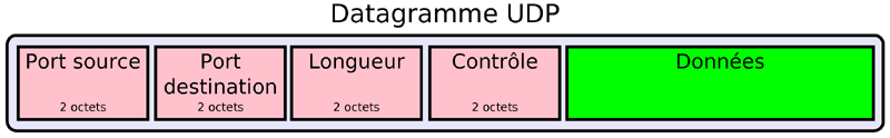 ( RFC 768 ) Protocole sans connexion de niveau 4 en principe utilisé au-dessus de IP lorsque la sécurité de TCP n'est pas utile; par exemple pour des flux audio ou vidéo. L'en-tête n'est que de 8 octets.