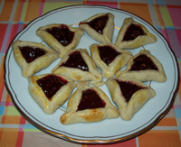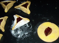 Placer une noisette de confiture au centre, dorer le pourtour, former le tricorne en pressant bien les 3 angles et dorer l'extérieur.
