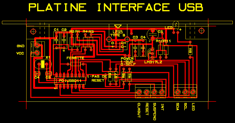 Puis le tracé du circuit imprimé. La carte est aux mêmes dimensions que la carte du PIC. Le PDIUSBD11 étant généralement livré en boitier CMS il faudra utiliser ( ou réaliser) une petite platine de conversion CMS --> DIL. Les borniers sont au pas de 5mm (Et non de 5,08 mm)