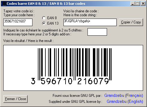 'Retour : * une chaine qui, affichée avec la police EAN13.TTF, donne le code barre